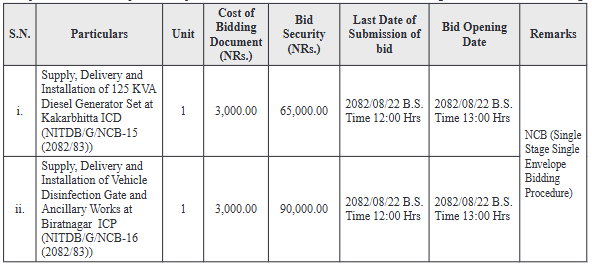 1. Nepal Intermodal Transport Development Board (NITDB) invites electronic bid from eligible bidders for the following: