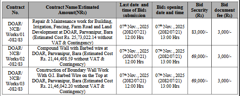 The Directorate of Agricultural Research, Madesh Pradesh, Parwanipur, Bara (DOAR) invites electronic Bids from Nepalese eligible bidders for the construction works given table below. Bidders may obtain further information at the office Directorate of Agricultural Research, Madesh Pradesh, Parwanipur, Bara (DOAR) mailing address: [email protected], Telephone: 9860569765, 9855012163 or may visit PPMO website www.bolpatra.gov.np/egp.