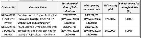 The Agricultural Machinery Testing and Research Centre, (AMTRC) Nawalpur, Sarlahi invites electronic bids (Sealed Bolpatra) from Nepalese eligible bidders for the construction of works and purchases of goods are given in the table below. Bidders may obtain further information at the office of Agricultural Machinery Testing and Research Centre, (AMTRC) Nawalpur, Sarlahi mailing address: [email protected], Telephone: 046-570314 or may visit PPMO website www.bolpatra.gov.np/egp.