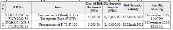5. Electronic bids must be submitted to the office Department of Health Services Management Division Teku Kathmandu through PPMO's e-GP system www.bolpatra.gov.np/egp on or before 13:00 hr; 12 November 2025. Bids received after this deadline will be rejected.