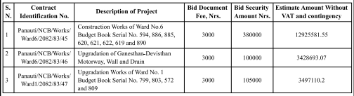 The Office of the Municipal Executive, Panauti municipality, invites electronic bids from Nepalese Eligible Bidders for the following projects under National Competitive Bidding Procedures. Eligible Bidders may obtain further information from the www.bolpatra.gov.np and the Office of the Municipal Executive, Panauti municipality, Kavre.