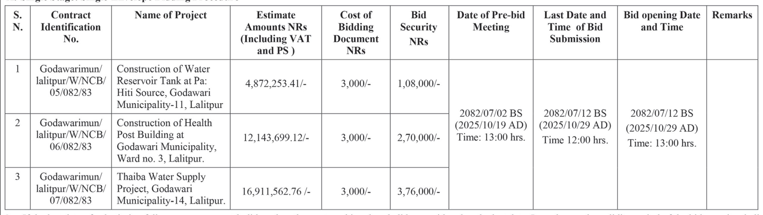 5. Eligible Bidders may obtain further information from the Godawari Municipality, Office of the Municipal Executive, Bajrabarahi, Lalitpur, Phone No. 01-5572592 during office hour, or may visit PPMO website:- www.bolpatra.gov.np/egp/