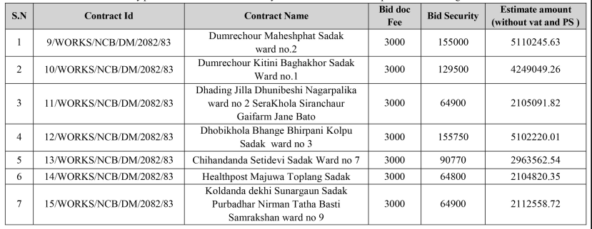 1. Dhunibeshi Municipality electronic bids from Nepalese eligible bidders for the construction of following bids.