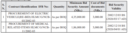 The Health logistics Management Center, Hetauda invites electronic bids from eligible bidders for the procurement of following goods under National Competitive Bidding. Eligible Bidders may obtain further information and inspect the bidding documents at the office of Health Logistics Management Center, Hetauda, Phone No: 977- 057520547, email address: [email protected] or may visit PPMO eGP system www.bolpatra.gov.np/egp.