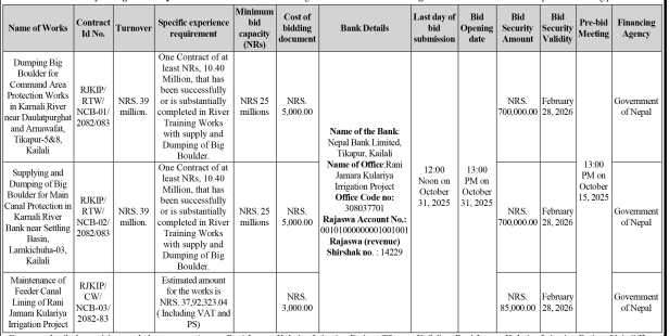 For more detail, please visit www.bolpatra.gov.np/egp or Rani Jamara Kulariya Irrigation Project, Tikapur, Kailali or Rani Jamara Kulariya Irrigation Project, Unit Office, Department of Water Resources & Irrigation, Jawalakhel, Lalitpur.