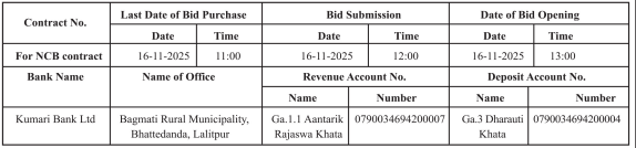 4. Bidders shall deposit the Bid Document Fee on the respective Bank A/C including name of Firm and Contract ID in bank deposit slip. Bidders can also deposit the Bid Document Fee on the Account Section of Bagmati Rural Municipality Office located at Bhattedanda Lalitpur. In that such case Bidders shall upload the revenue receipt instead of bank voucher.