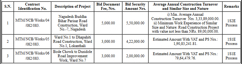 The Office of the Municipal Executive, Madhyapur Thimi Municipality, invites electronic bids from Nepalese Eligible Bidders for the following projects under National Competitive Bidding Procedures. Eligible Bidders may obtain further information from the www.bolpatra.gov.np and Office of the Municipal Executive, Madhyapur Thimi Municipality, Madhyapur Thimi, Bhaktapur during office hours.