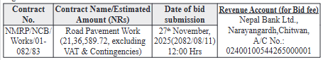 The National Maize Research Program, Rampur Chitwan, invites electronic Bids from Nepalese eligible bidders for the construction works given table below. Bidding is open to all eligible Bidders.