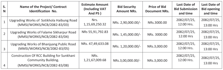 Melamchi Municipality invites electronic bids from eligible bidders for the following works under National Competitive Bidding Procedures.