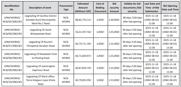 2. Gandaki Rural Municipality, Office of Municipal Executive, Invites Electronic Bids from eligible bidders for the following projects under National Competitive Bidding procedures.