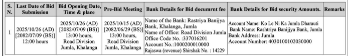 2. Eligible Bidders may refer complete set of Bid Document for further information at Road Division, Jumla, Khalanga or PPMO's website: www.bolpatra.gov.np/egp. And Bidders shall have the option of submitting their bids electronically only.