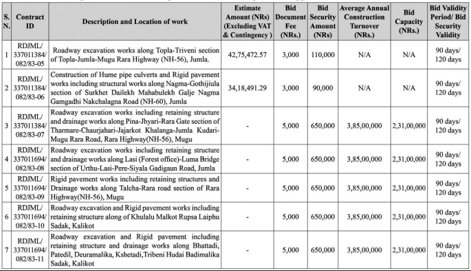 1. Government of Nepal, Ministry of Physical Infrastructure and Transport, Department of Roads, Road Division, Jumla, Khalanga, invites Open Competitive electronic bids from eligible bidders for the following works under the National Competitive Bidding procedure.