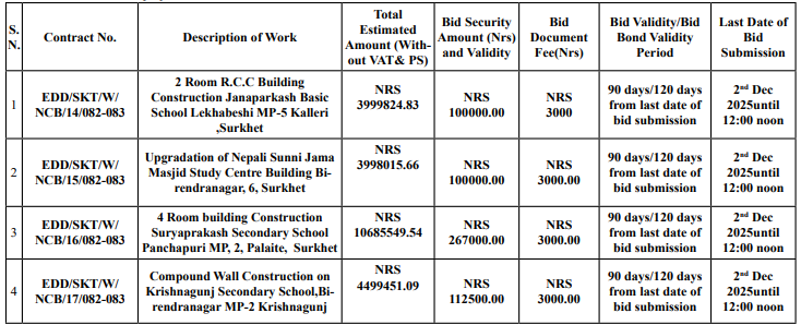 1. EDD, Surkhet invites following electronic bid from eligible Nepalese Bidders under National Competitive Bidding.