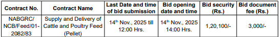 The National Animal Breeding And Genetics Research Centre, Khumaltar, Lalitpur invites electronic bids from eligible bidders for the Supply and Delivery of Cattle and Poultry Feed (Pellet) given table below. Bidders may obtain further information at the office of National Animal Breeding And Genetics Research Centre, Khumaltar, Lalitpur, telephone numbers 01-5423160 and email address [email protected] or may visit PPMO egp system www.bolpatra.gov.np/egp.