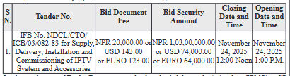 1. Nepal Telecom invites Electronic Bid from reputed and competent Bidders through 'Single Stage Two Envelope' procedure for the following tender.