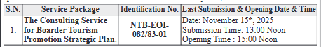 Nepal Tourism Board (NTB) invites National Competition Expression of Interest (EOI) from eligible Consultants for The Consulting Service for Boarder Tourism Promotion Strategic Plan under the National Competition bidding procedures for shortlisting the consultants specified in Public Procurement Act and NTB's Financial Bylaws;