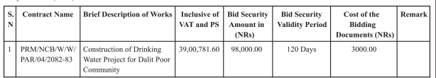 1. Paiyun Rural Municipality, Huwas, Parbat invites online electronic bids under e-procurement system from eligible bidders for the Construction of following project mentioned below under National Competitive Bidding-Single Stage Single Envelope Bidding procedures (ISIE).