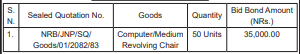 1. The Nepal Rastra Bank (NRB), Janakpur Office invites sealed quotations from registered Suppliers for the supply, delivery and installation of above goods.