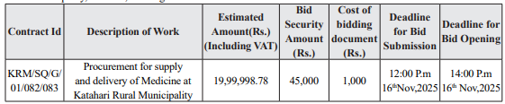 Katahari Rural Municipality, Katahari, Morang invites electronic bids from Nepalese eligible bidders for the following Works under Sealed Quotation (SQ) Single Stage Envelope System Bidding Procedure.Bidders may obtain further information from the PPMO web portal website: www.bolpatra.gov.np/egp with Public Entity Name: Katahari Rural Municipality,Katahari, Morang.