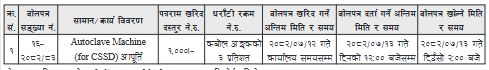 यस इन्स्टिच्युटद्वारा सञ्चालित फिओच- काठमाण्डौ बाल अस्पतालमा अ.व. २०७२/७३ का लागि Autoclave Machine (for CSSD) खरिदका लागि बोलपत्र न. १४- २०८२ २०८३) मिति २०८२/०४/०७ गतेको गोरखापत्रमा सूचना प्रकाशित गरी आस्वान गरिएको बोलपत्र रद्द भएको हुनाले सो कार्यका लागि पुनः बोलपत्र आह्वान गरिएको छ। सो कार्य गर्न योग्यता पुगेका इच्छुक उत्पादक, फर्म/सप्लायर्स / कम्पनीबाट दत्त प्रमाणपत्र, अद्यावधिक गरेको आधिकारिक इजाजत प्रमाणपत्र मूल्य अभिवृद्धि कर प्रमाणपत्र, आ.व. २०७१/०७२ को कर चुक्ता प्रमाण पत्रहरूको प्रमाणित प्रतिलिपि फाराम खरिद दस्तुर बापतको रकम इन्स्टिच्युटको सानिमा बैंक, नक्साल शाखामा रहेको खाता नं. ००१०१००१०००२०६३ मा जम्मा गरेको बैंक भौचर तथा उल्लिखित धरौटी बापतको रकम इन्स्टिच्युटको सिद्धार्थ बैंक लिमिटेड, हात्तीसार शाखामा रहेको खाता नं. ५५५०७६३७९२७ मा जम्मा गरेको बैंक भौचर वा बैंक ग्यारेन्टीको हकमा बोलपत्र दाखिला गर्ने अन्तिम मितिदेखि गणाना हुनेगरी कम्तीमा १२० ( एक सय बीस दिन मान्य अवधि भएको नेपाल राष्ट्र बैंकबाट क वर्गको मान्यता प्राप्त वाणिज्य बैंकबाट जारी गरिएको बैंक ग्यारेन्टी पत्र संलग्न राखी तल उल्लिखित मिति र समयभित्र इन्स्टिच्युटको कार्यालयबाट बोलपत्र फाराम खरिद गर्ने तथा तल उल्लिखित मिति र समयभित्र इन्स्टिच्युटको कार्यालयमा आ-आफ्नो बोलपत्रहरू पेश गर्नुहुन यो सूचना प्रकाशित गरिएको छ । बोलपत्र बुझाउने र खोले दिन सार्वजनिक बिदा परेमा त्यसपछि लगत्ते कार्यालय खुलेको दिन सो कार्य गरिनेछ। अन्य विस्तृत जानकारीका लागि यस इन्स्टिच्युटको प्रशासन शाखामा कार्यालय समयभित्र सम्पर्क राख्न सकिने व्यहोरा समेत जानकारी गराइन्छ ।