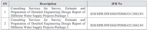 The Planning And Disaster Management Section under DWSSM invites Expression of Interest (EOI) from eligible consulting firms ("consultant") to provide the following consulting services for the Fiscal year 2082/83 at the national level through electronic means. Interested eligible consultants may obtain further information and EOI document from the website of Public Procurement Monitoring Office: www.bolpatra.gov.np/egp
