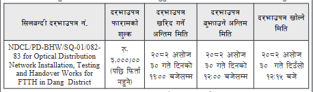 यस निर्देशनालयका लागि Optical Distribution Network Installation, Testing and Handover Works खरिद गर्नुपर्ने भएकाले मू.अ.करमा दर्ता भएका इच्छुक फर्म तथा संस्थाहरूलाई सिलबन्दी दरभाउपत्रको अधीनमा रही निम्नानुसारको सिलबन्दी दरभाउपत्र पेश गर्नुहुन सम्बन्धित सबैको जानकारीका लागि अनुरोध छ ।