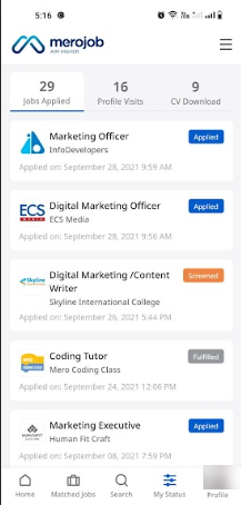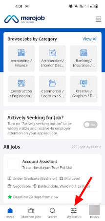 Open your merojob mobile app, log in, and click on the "My Status" tab.