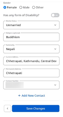 Select religion, nationality, and provide current and permanent addresses along with contact numbers.